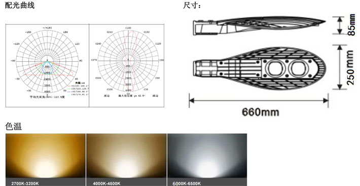 2.光學玻璃透鏡,可靠的二次光學設計及的角度定位,提高光照效果;有TYPEⅡ TYPEⅢ等多種配光方式,適用于二車道三車道四車道等多種路面;