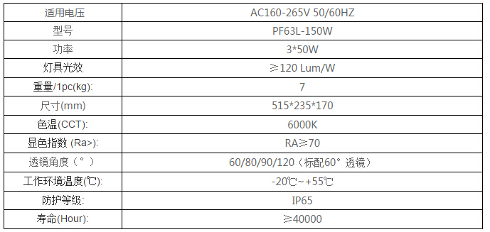 LED泛光燈PF63L-150W主要參數
