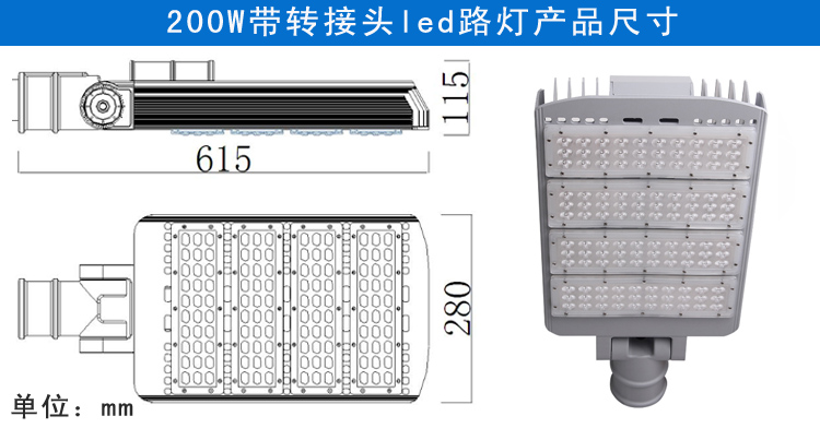 產品特點: 1.燈臂角度可180°調節,照射角度可隨意變化 2.采用高亮度LED芯片,亮度高、顯色性好 3.鋁加工而成,對流散熱設計,散熱性能好,保障光源使用壽命 4.抗17級風力,無形變、松動等現象,異常牢固 5.防護等級IP65 適用范圍: 主干道路、高速公路、高架路、市區街道、天橋、人行道等道路照明,以及廣場、學校、住宅區、工業區、公園等其他需要戶外照明的場所。 產品規格(Product Spec):PL29L-200W LED路燈